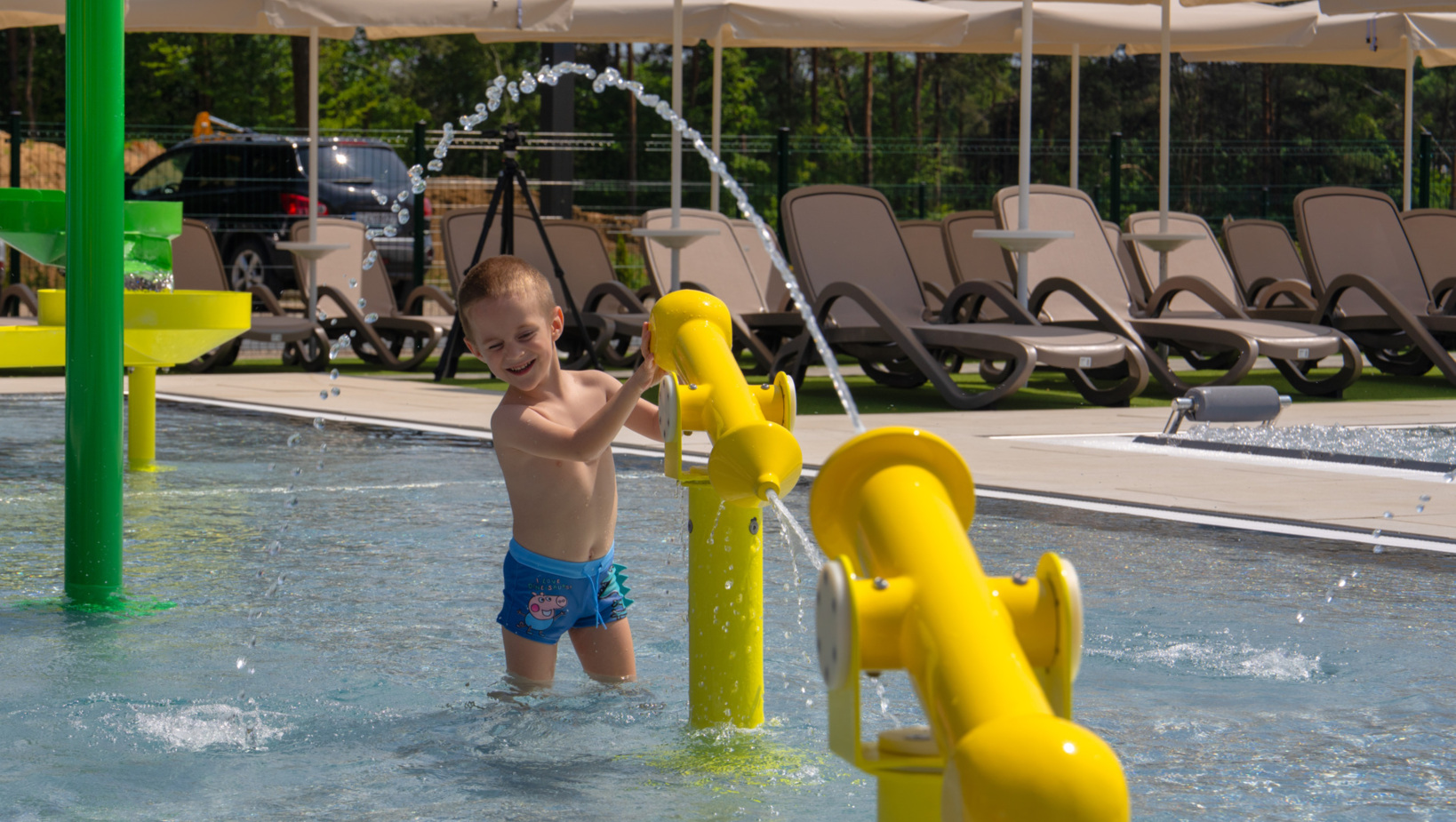 - Brodzik dla dzieci wyposażony w 3 zjeżdżalnie, grzybki, armatki wodne, wiaderka, zjeżdżalnie „słonik” i inne interaktywne elementy,