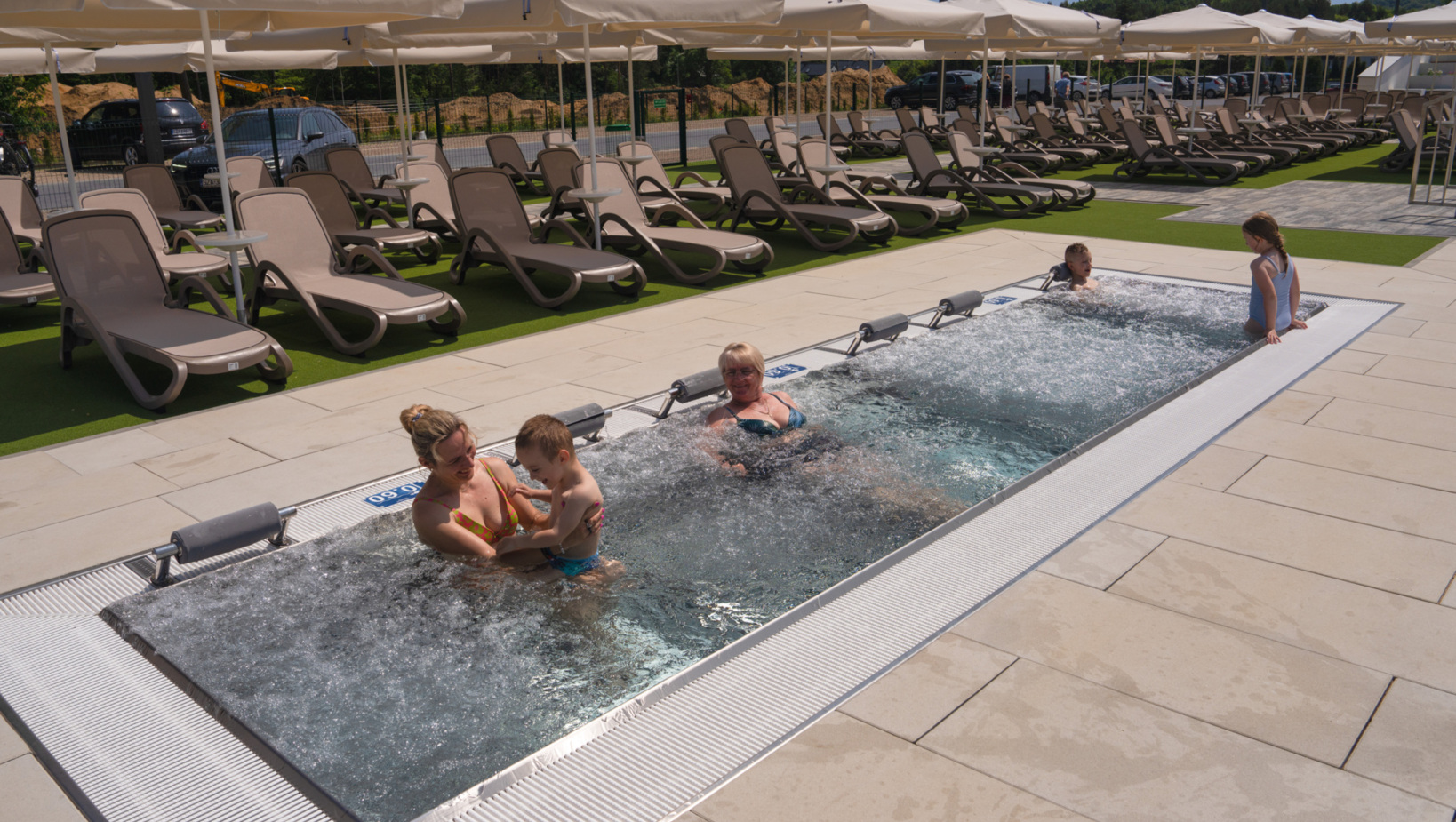 - Basen rekreacyjny z kurtyną wodną o głębokości 1,20m i powierzchni 240m2,